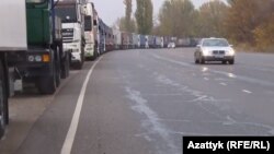 Вереница грузовых машин на территории Кыргызстана, ожидающих въезда в Казахстан. 19 октября 2017 года.