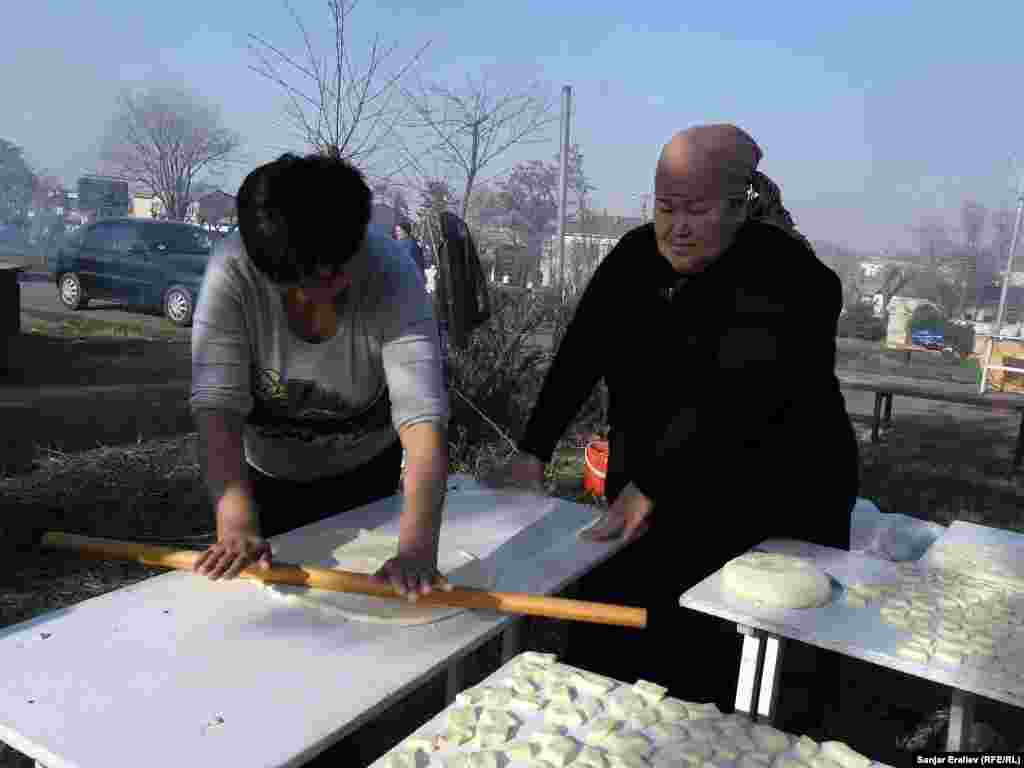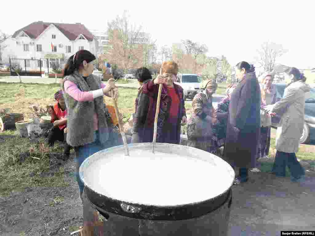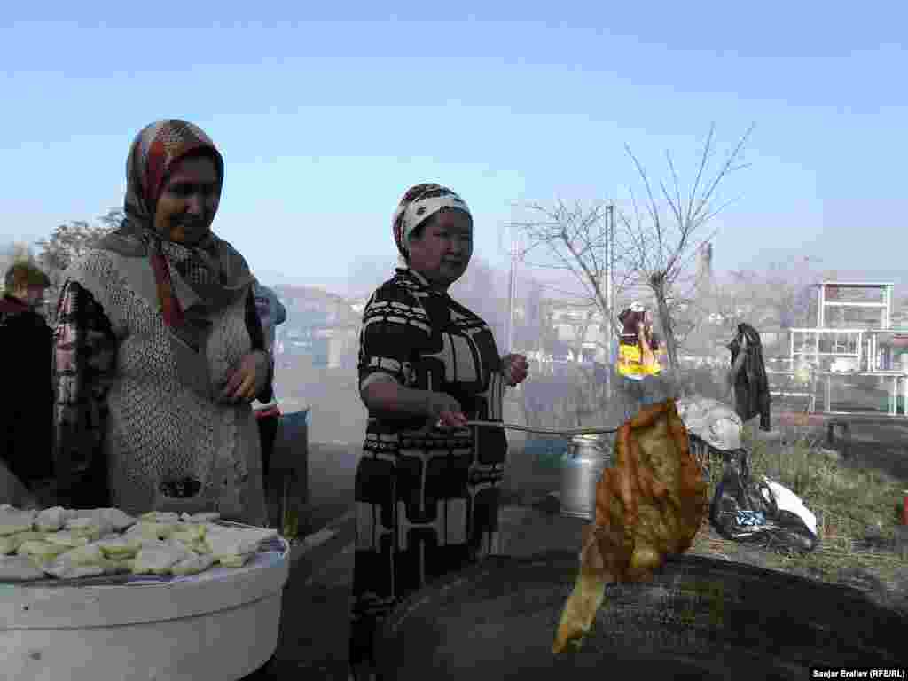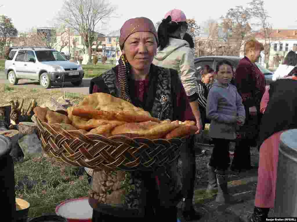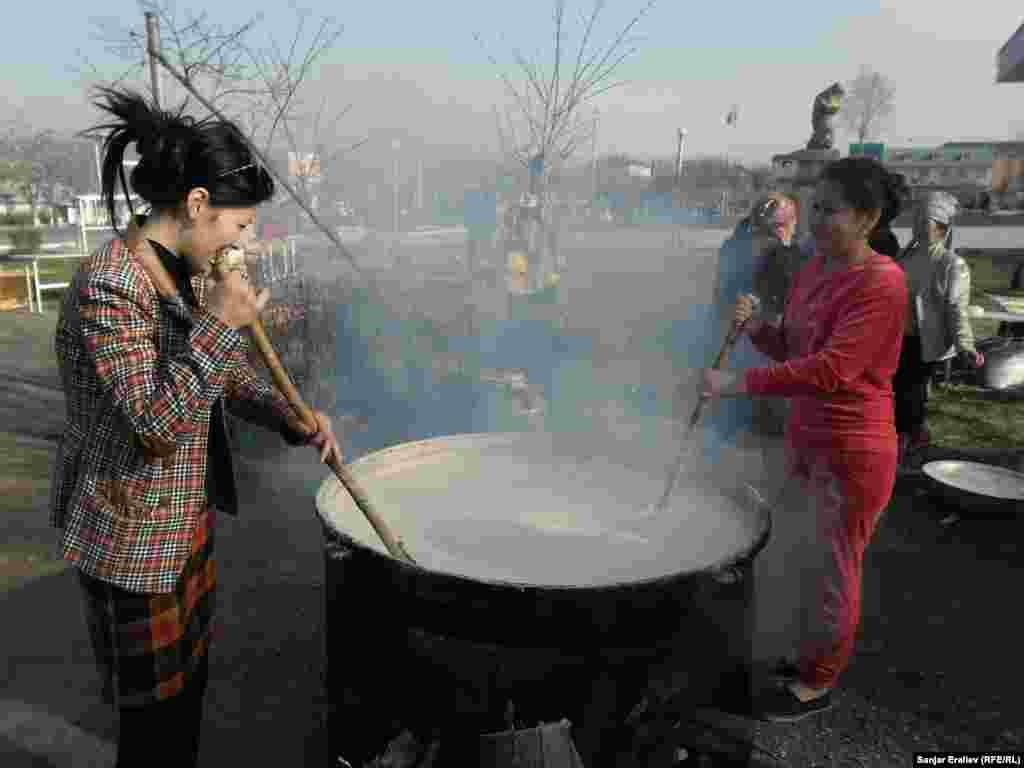 В самом центре Оша, на площадке у Кыргызского национального драматического театра имени Ибраимова городские власти организовали праздничные гулянья и приготовление праздничного блюда "сумолек". "Азаттык", Кыргызская служба РСЕ\РС